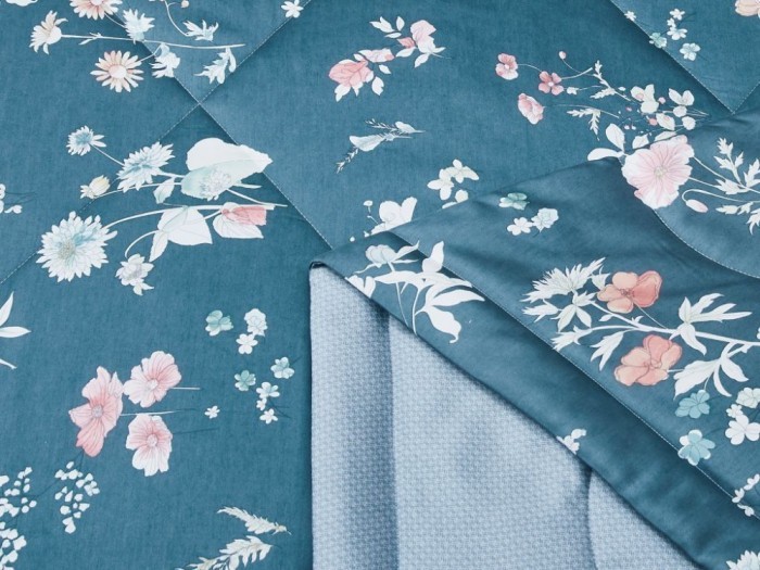 Глубокий сине-зелёный цвет основной ткани с рисунком цветов, великолепно оттеняется приглушенно-голубым цветом ткани-компаньона с мелким принтом.